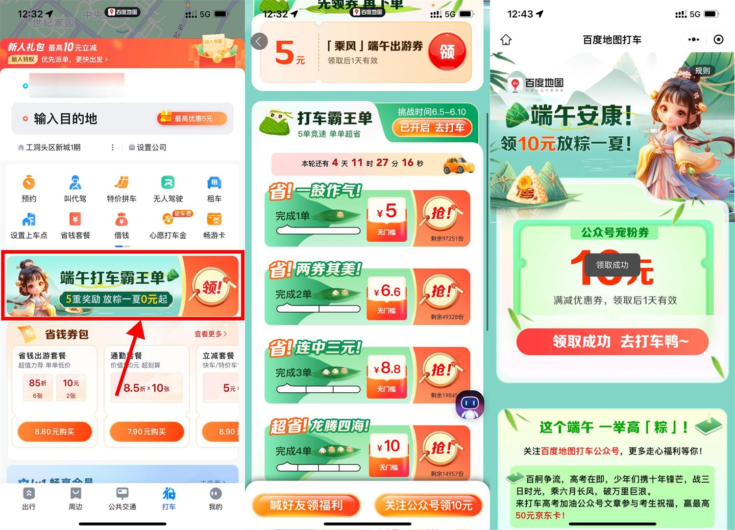百度地图APP底部“打车”->端午打车霸王单->先直接领5亓打车券,累计打车1/2/3/4/5次分别领5/6.6/8.8/10/15亓券,刚好要打车的可以看看!