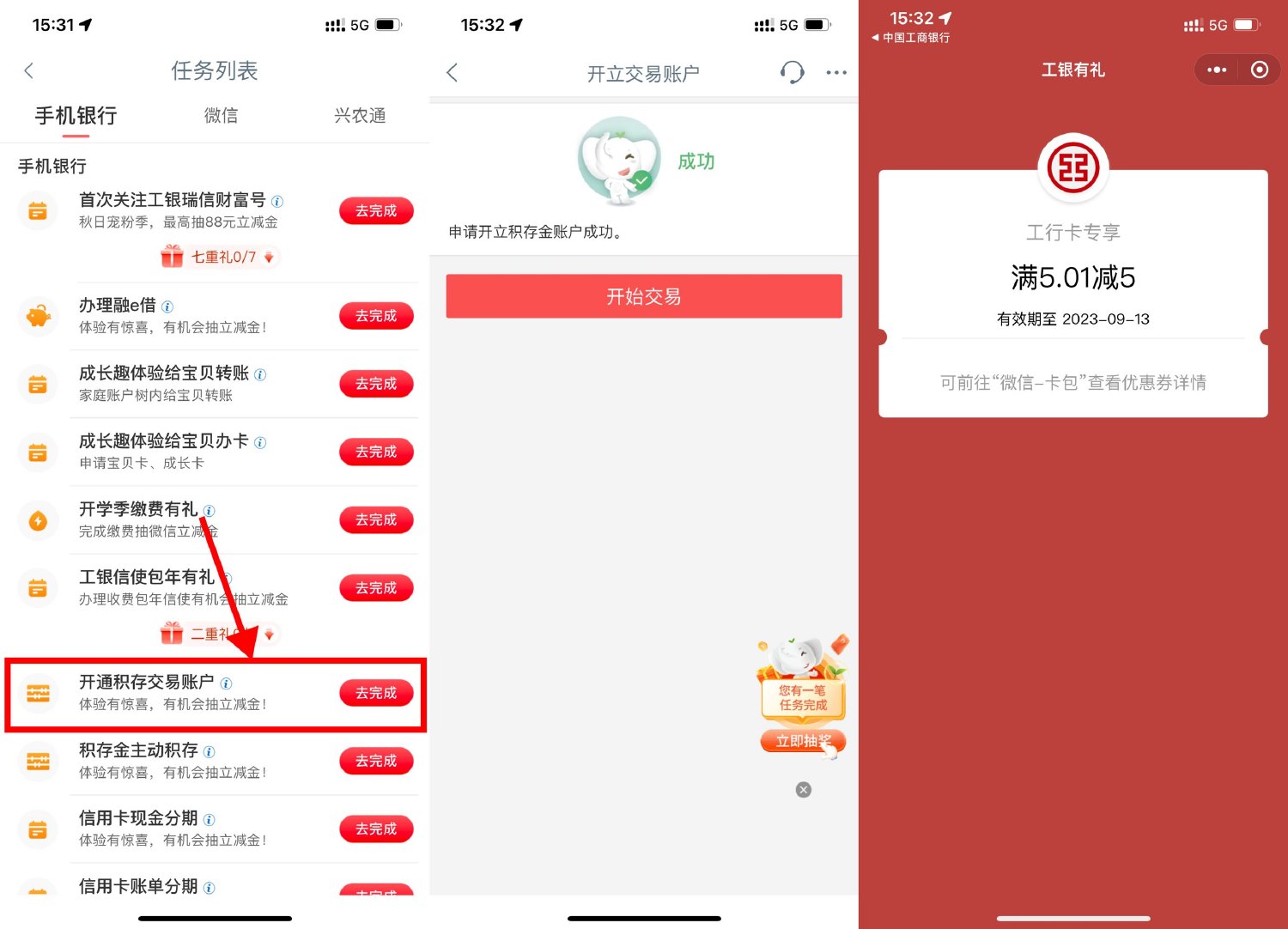 工行APP搜索“任务中心”->找到积存金去完成->点我的持倉开通后返回页面抽立减金(之前开通过的先注销然后重新开)