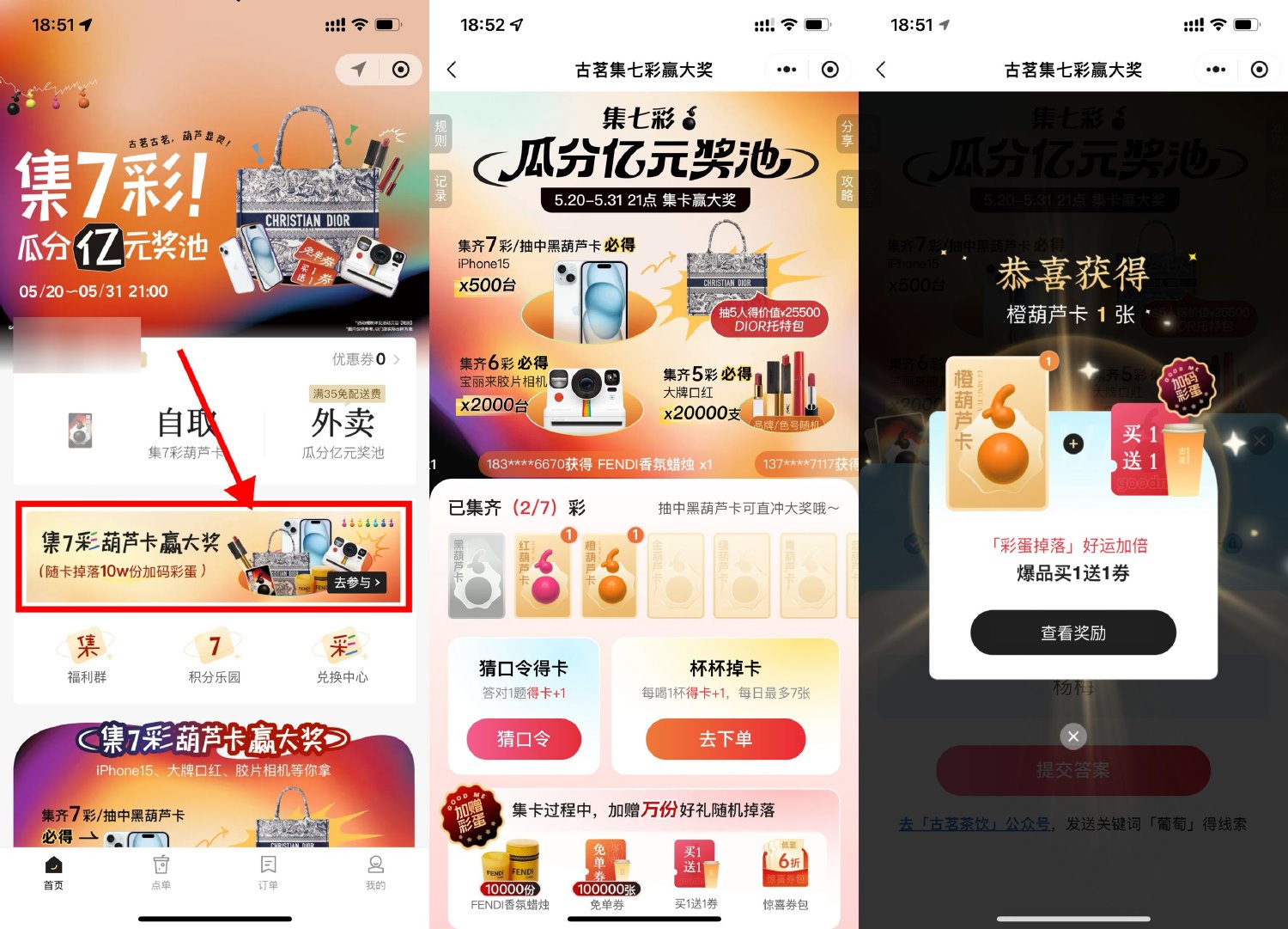 微信进入#小程序:古茗茶饮点单 ->集7彩葫芦卡->每天输口令得葫芦卡+随机抽免单券、实物、买一送一券,集齐5~7彩必得图2的实物