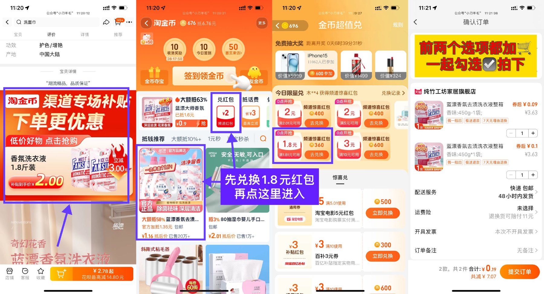3、返回淘金币页面,2个选项一起拍下,到手0.19亓2袋450g洗衣液