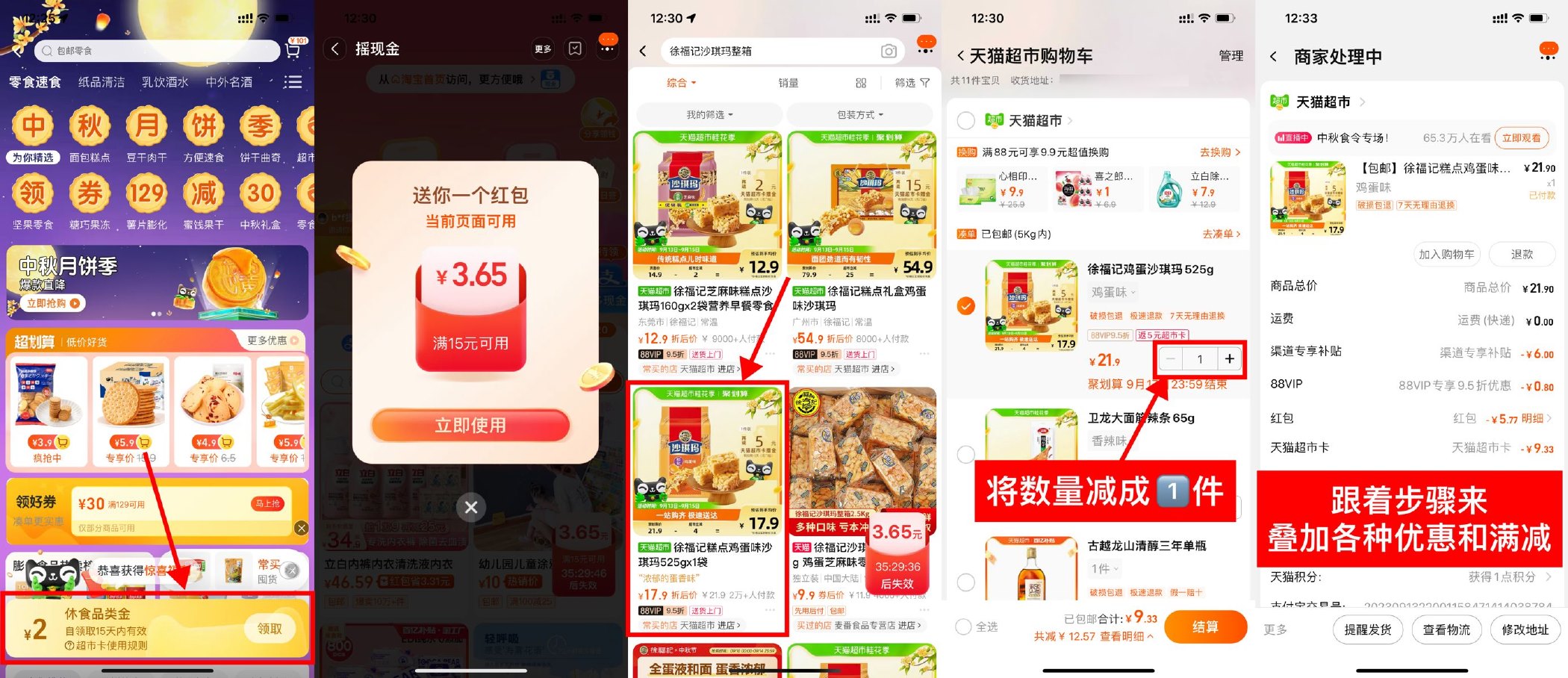 4、红包点“立即使用”搜索“徐福记沙琪玛整箱”找到图3的加入到购物车