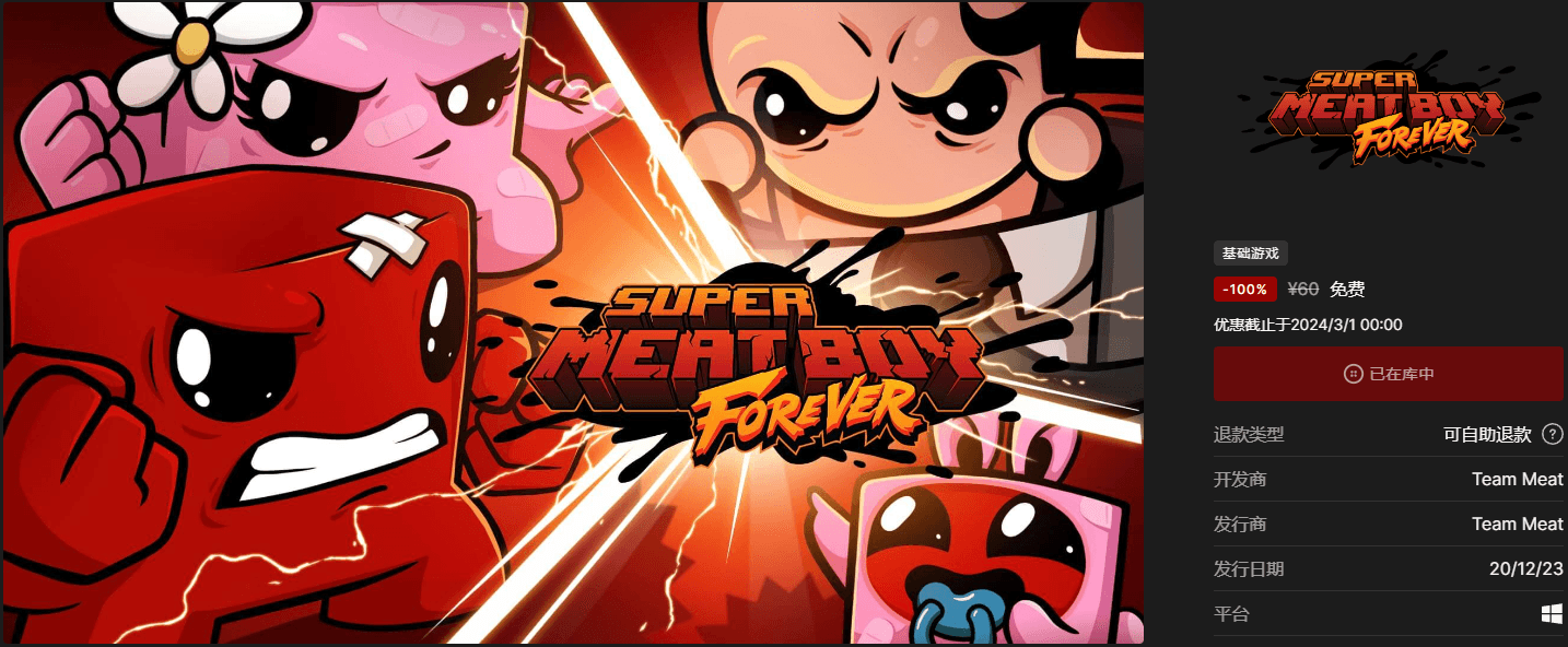 领取地址:https://store.epicgames.com/zh-CN/p/super-meat-boy-forever