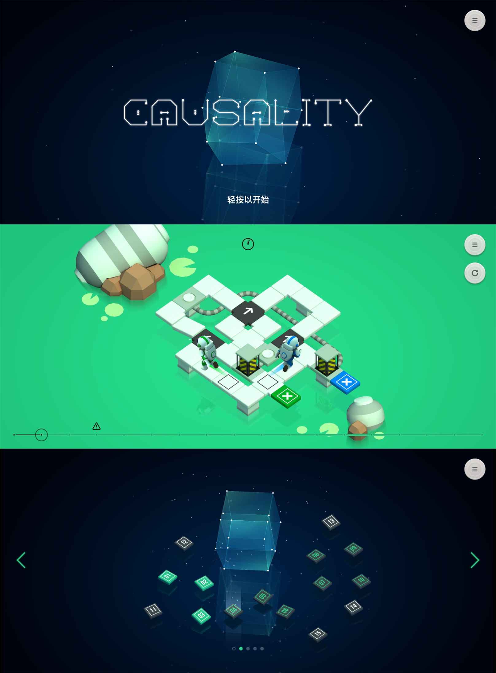 因果是一款关于操纵时间、改变事件的顺序并改变每一关结果的一个解谜游戏。游戏发生在奇怪的外星世界,你要帮助一群受困的宇航员找到一条安全的路线。(完成前两关即可解锁全部关卡)